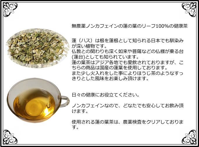 ■名称:蓮の葉茶 ■内容量:30g(2g×15ティーバッグ) ■原材料:ハス葉 ■保存方法:直射日光、高温多湿を避け、乾燥した冷暗所で保管してください ■賞味期限:商品の裏面に記載 ■製造者:有限会社サンドラSS(又は有限会社サンドラST) 〒125-0035 東京都葛飾区南水元2-16-8 ※ラベルやパッケージは変更する場合がございます。